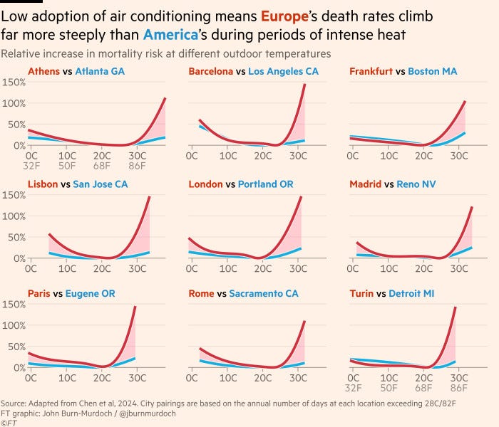 Perché sta accadendo questo cambiamento? Non c’è una risposta univoca. Probabilmente giocano un ruolo diversi fattori: comportamenti più prudenti, maggiore assistenza agli anziani e alle persone fragili e diffusione dell’aria condizionata, che in Europa resta meno comune che negli Stati Uniti ma sta aumentando. Ci sono studi che mostrano come, proprio per la scarsa diffusione dell’aria condizionata, in Europa si muoia di più d’estate rispetto agli Stati Uniti in condizioni simili di temperatura.