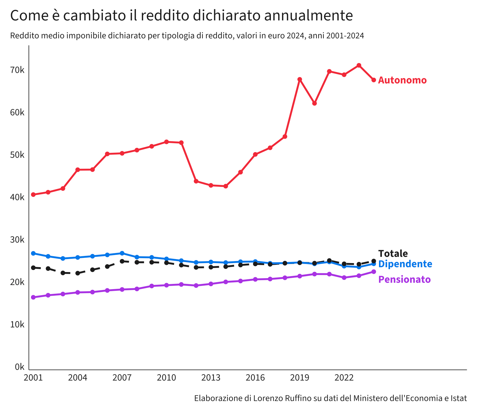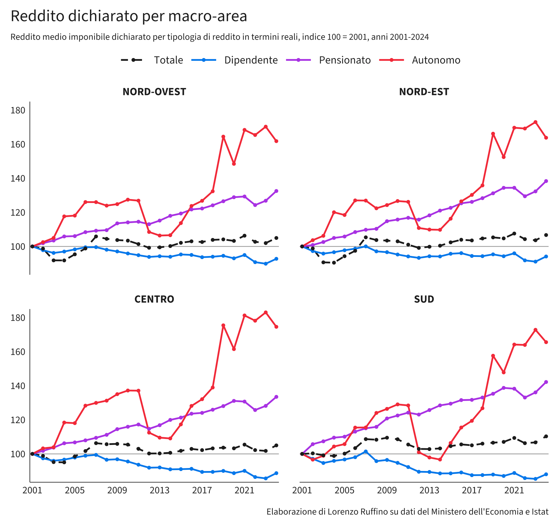 I lavoratori autonomi hanno dichiarato in media 67.580 euro, in crescita reale del 67 per cento sul 2001. È il dato più netto, ma anche quello che richiede più cautela. Sappiamo infatti che l’evasione si concentra proprio tra gli autonomi ed è realistico assumere che una parte della crescita rifletta una progressiva emersione più che un effettivo miglioramento delle condizioni economiche. La dinamica di lungo periodo va letta con la consapevolezza che la base imponibile dichiarata cambia anche per ragioni che non hanno a che fare con il reddito effettivo.