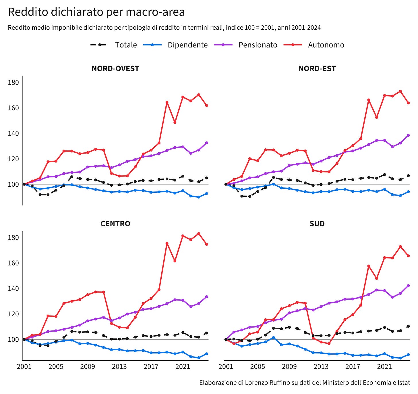 Il quadro di lungo periodo conferma anche il divario geografico. Nel 2024 il reddito medio dichiarato è di 27.970 euro nel Nord-Ovest, 26.340 nel Nord-Est, 25.660 nel Centro e 20.390 nel Mezzogiorno. La distanza tra la macroarea più ricca e quella più povera è di 7.580 euro, il 37 per cento. Per ricalcolare la serie storica per macroarea ho usato l’indice nazionale dei prezzi, perché un indice del costo della vita disaggregato a livello regionale e aggiornato annualmente in Italia non esiste. Bisogna inoltre tenere conto che che abitare nelle grandi città del Nord oggi costa molto di più che vivere in un comune medio del Mezzogiorno e che sul reddito disponibile le differenze sono realisticamente minori. .