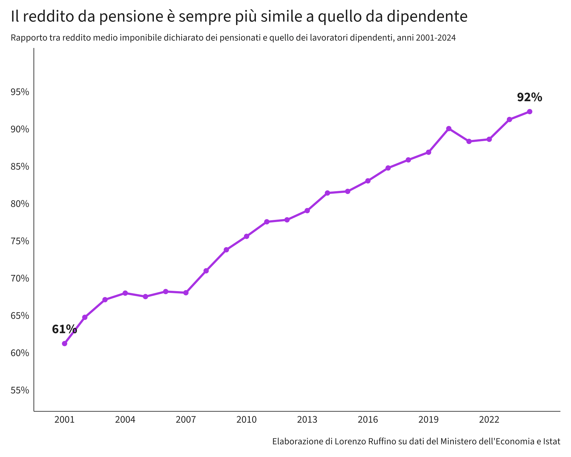 Tra le tre traiettorie, quella che pesa di più sul lungo periodo è il rapporto fra il reddito da lavoro dipendente e quello da pensione. Nel 2001 un pensionato medio dichiarava il 61 per cento di quanto dichiarava un dipendente medio. Nel 2024 questa percentuale è salita al 92 per cento. In ventitré anni le due figure si sono quasi sovrapposte e oggi un pensionato medio dichiara appena 1.860 euro lordi in meno all’anno di un lavoratore dipendente medio.