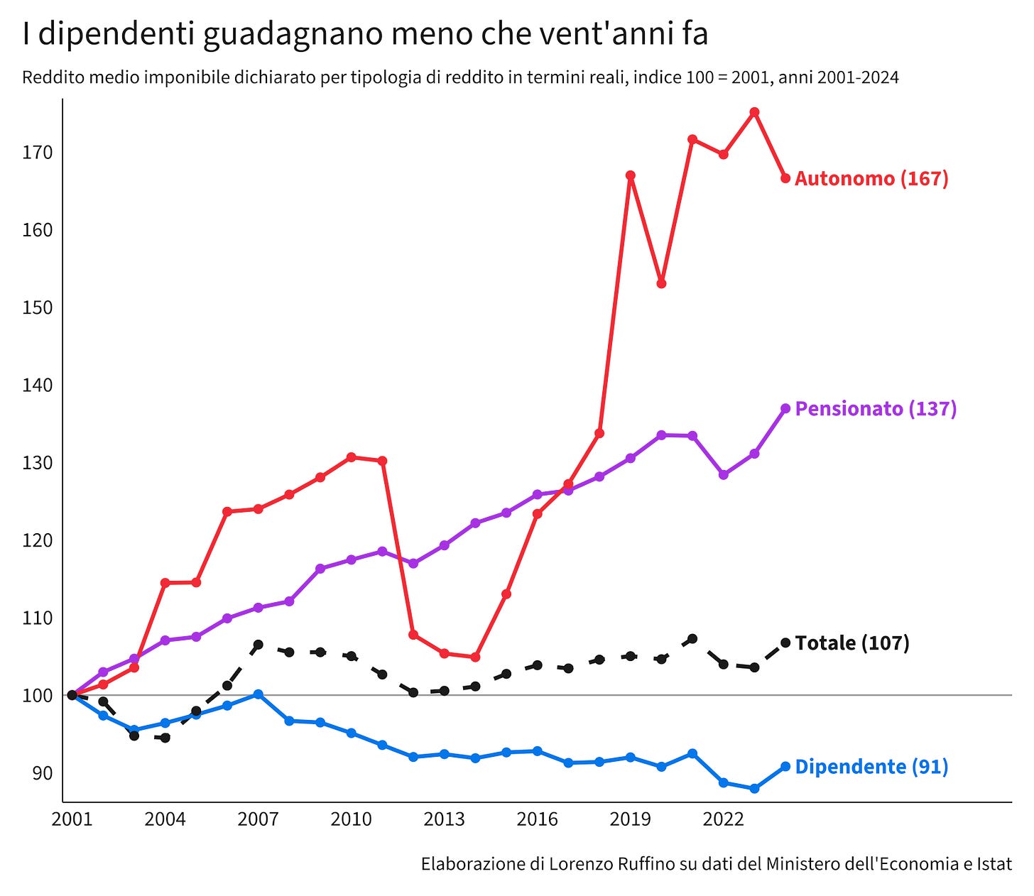La media nazionale quasi piatta è il risultato di tre traiettorie che vanno in direzioni diverse. I lavoratori dipendenti hanno dichiarato in media 24.250 euro nel 2024, contro 26.700 euro del 2001 ai prezzi di oggi. La perdita reale è del 9,2 per cento in ventitré anni. Il dipendente medio italiano ha oggi un potere d’acquisto inferiore a quello che aveva all’inizio del secolo. Il recupero degli ultimi due anni, sostenuto dai rinnovi contrattuali e dal taglio del cuneo fiscale, ha attenuato il dato ma non lo ha invertito.