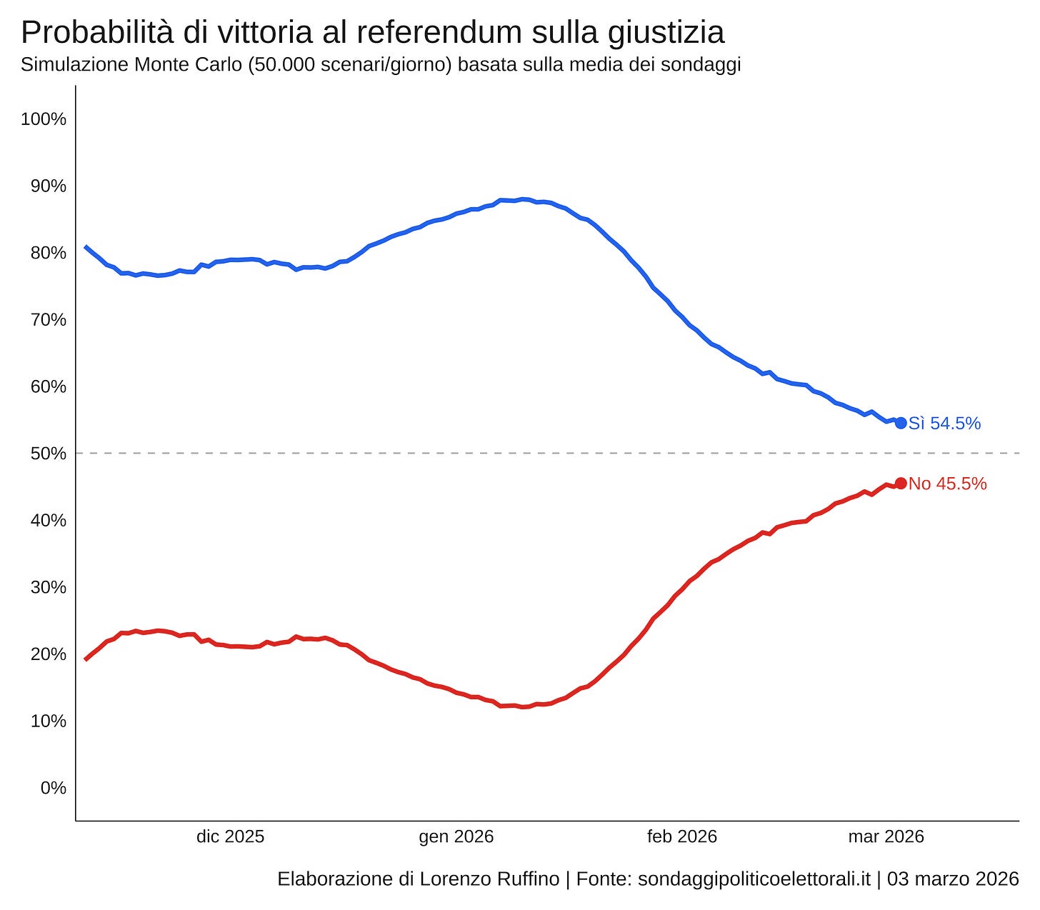 Per tradurre i sondaggi in probabilità di vittoria si può ricorrere a una simulazione Monte Carlo: un metodo che genera migliaia di scenari possibili a partire dalla media e dal margine di incertezza, tenendo conto anche dell’errore storico dei sondaggi referendari. Il modello simula 50 mila risultati e conta quante volte vince il Sì e quante il No. Al 3 marzo il Sì ha il 54,5 per cento di probabilità di vittoria, il No il 45,5. In pratica: su venti scenari simulati, in undici vince il Sì e in nove il No. Non è un pareggio, ma ci si avvicina molto.