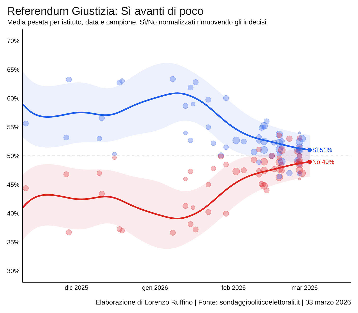In conclusione, i dati ad oggi dicono che il referendum sulla separazione delle carriere è una competizione apertissima. Il Sì è in leggero vantaggio, ma il trend delle ultime settimane è dalla parte del No. Le prossime due settimane, quelle in cui non vedremo più sondaggi, saranno quelle in cui si deciderà tutto.